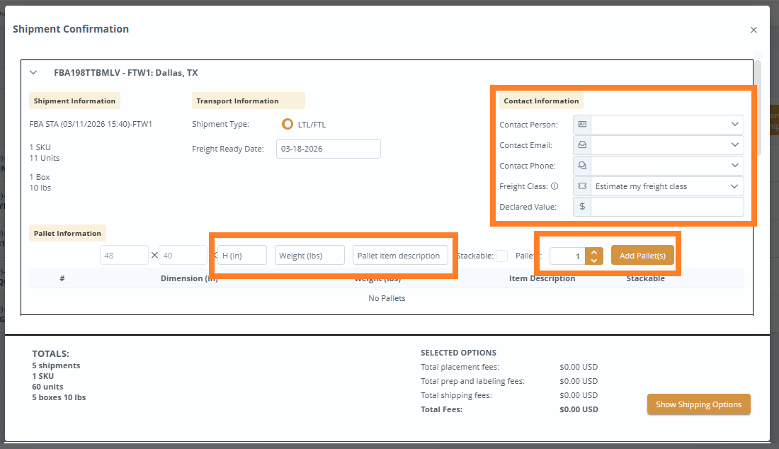 - In the pop-up window, enter your contact information and pallet info, then press 'Add Pallets'.